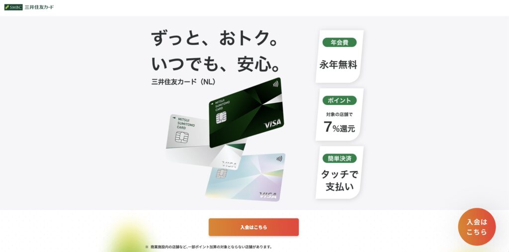 下のボタンを押すと、三井住友カード(NL)の公式ページに飛びます(別のタブが開きます)。