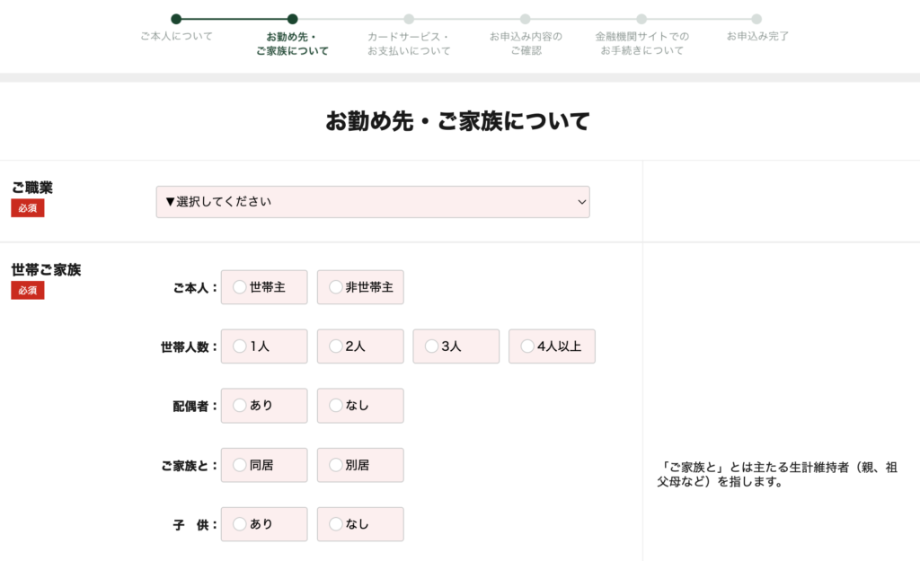 「次へ」を押すと「お勤め先・ご家族について」というページに移ります。