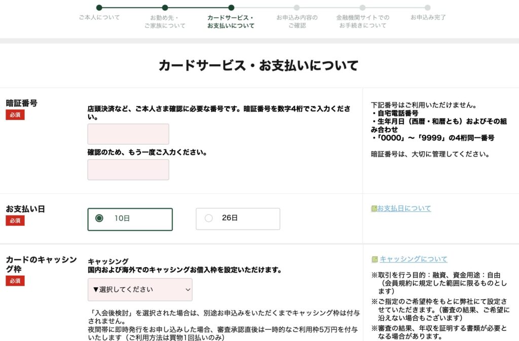 「次へ」を押すと「カードサービス・お支払いについて」というページに移ります。