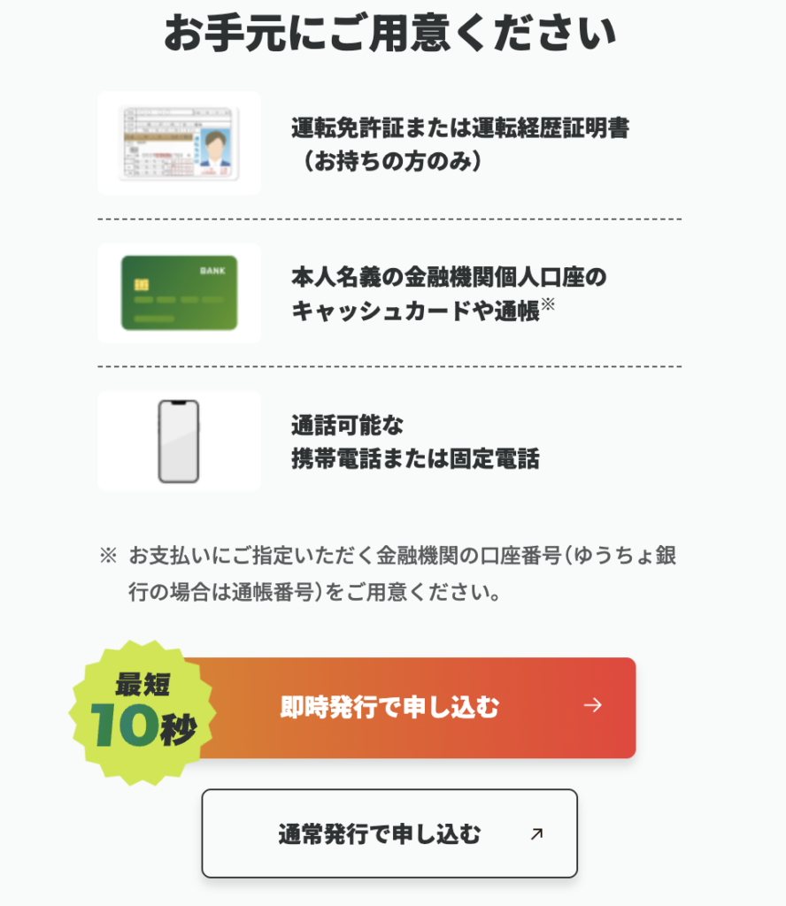 を用意した上で、「最短10秒 即時発行で申し込む」をクリックします。