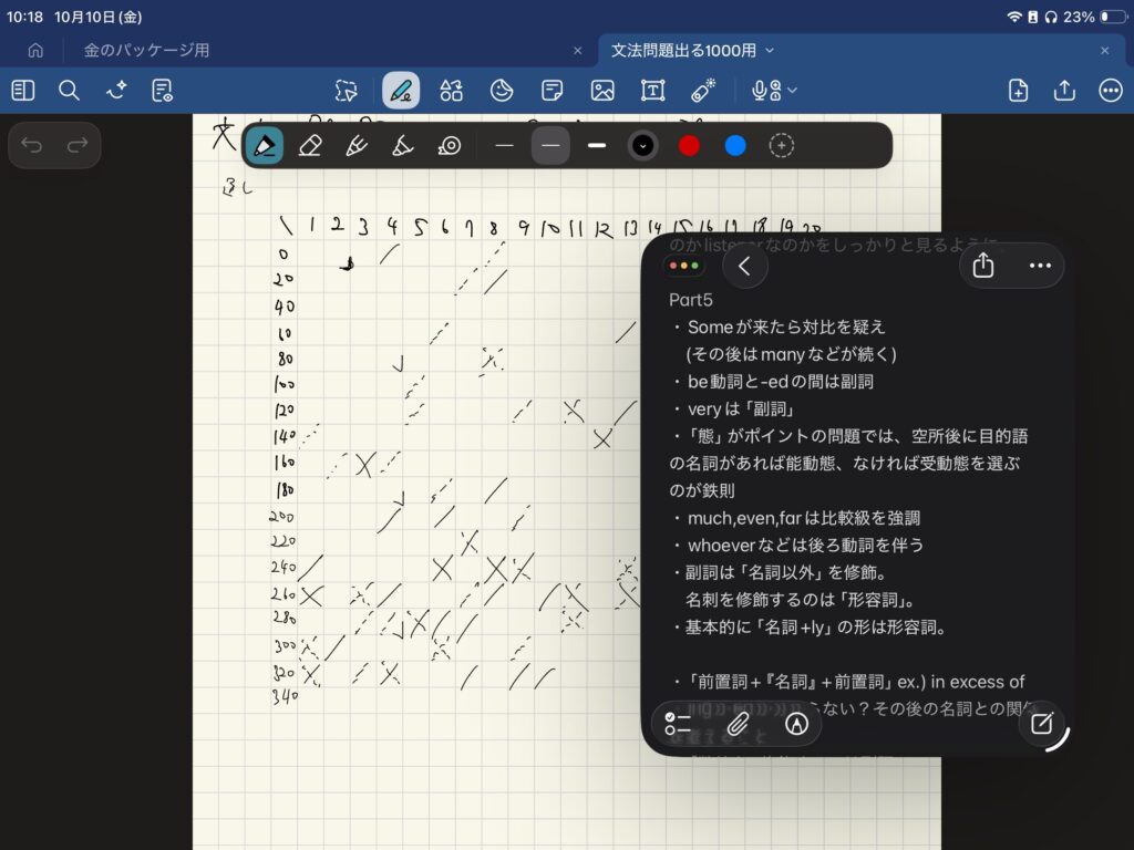 例えばTOEICの勉強では、全体にノートをとり、気になったところはすぐにメモにとれるよう分割表示しています!